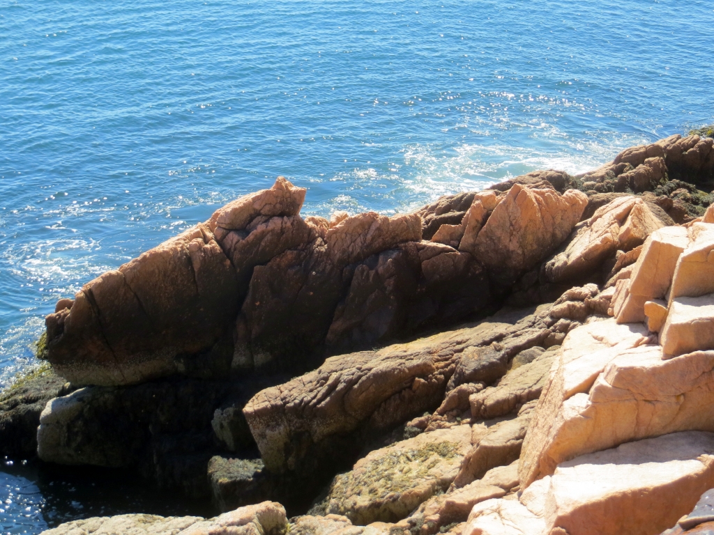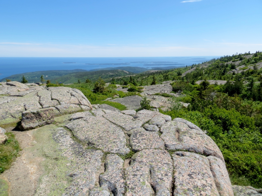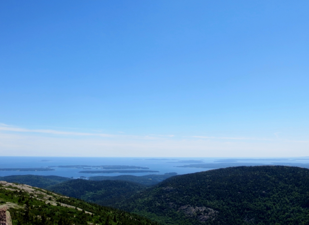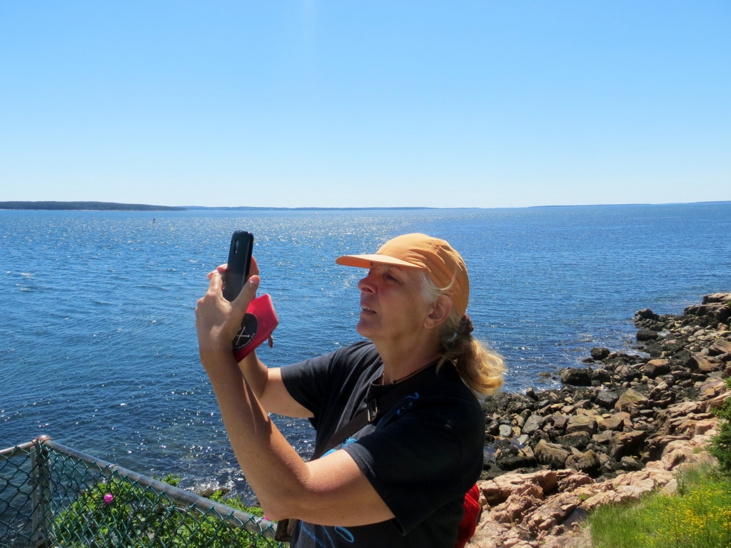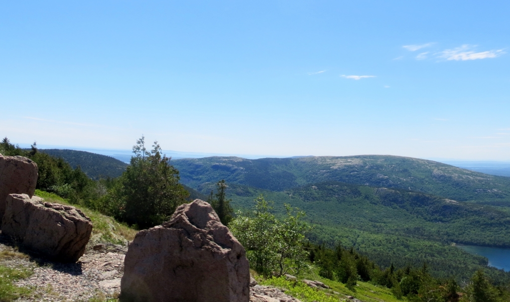 Noch bevor man sie erreicht, zweigt rechts die Straße in den Nationalpark Acadia ab, den wir am folgenden Tag anfahren. Wie gut, dass wir uns die 25$ sparen können, wir haben ja einen Jahrespass. Danke wieder mal, liebe Kollegen! Acadia erstreckt sich im Osten der Insel und ist der erste Nationalpark, der in den 30er Jahren östlich des Mississippi gegründet wurde. Seine Attraktion liegt nicht zuletzt in dem 466m hohen Mount Cadillac, dessen Gipfel einen kompletten Rundblick erlaubt und auf dem man morgens, z. Zt. um 4.30h, die ersten Sonnenstrahlen sehen kann, die auf die USA treffen. Unsére Sache ist das nicht wirklich – zur Schlafenszeit und bei der Kälte nachts – aber hoch fahren wir natürlich und werden mit einem Rundblick belohnt, der seinesgleichen sucht. Leider ist es etwas diesig, trotzdem ein Traumplatz. Wir nehmen den 24 Meilen langen Round Loop, der am Meer entlang zuerst nach Süden führt, um dann in einer großen Schleife im Landesinnern zurückzuführen. Weit unten halten wir am Thunder Hole, wo die Brandung eine große Felsgruppe ausgehöhlt hat, sodass das hineinschlagende Wasser donnernde Geräusche erzeugt. Leider nur bei entsprechend rauer See und ca. zwei Stunden vor High Tide zu hören, die falsche Zeit für uns, aber das hält uns und gefühlte 100 Andere nicht davon ab, auf die Klippen hinauszuklettern und zu fotografieren. Der Teil des Loops im Landesinnern ist relativ langweilig, Bäume eben, und was man dem an Fahrspaß entgegensetzen könnte, wird von der durchgängigen Geschwindigkeitsbegrenzung von 35 mi doch stark reduziert.