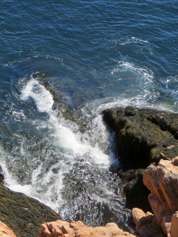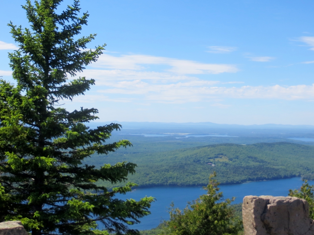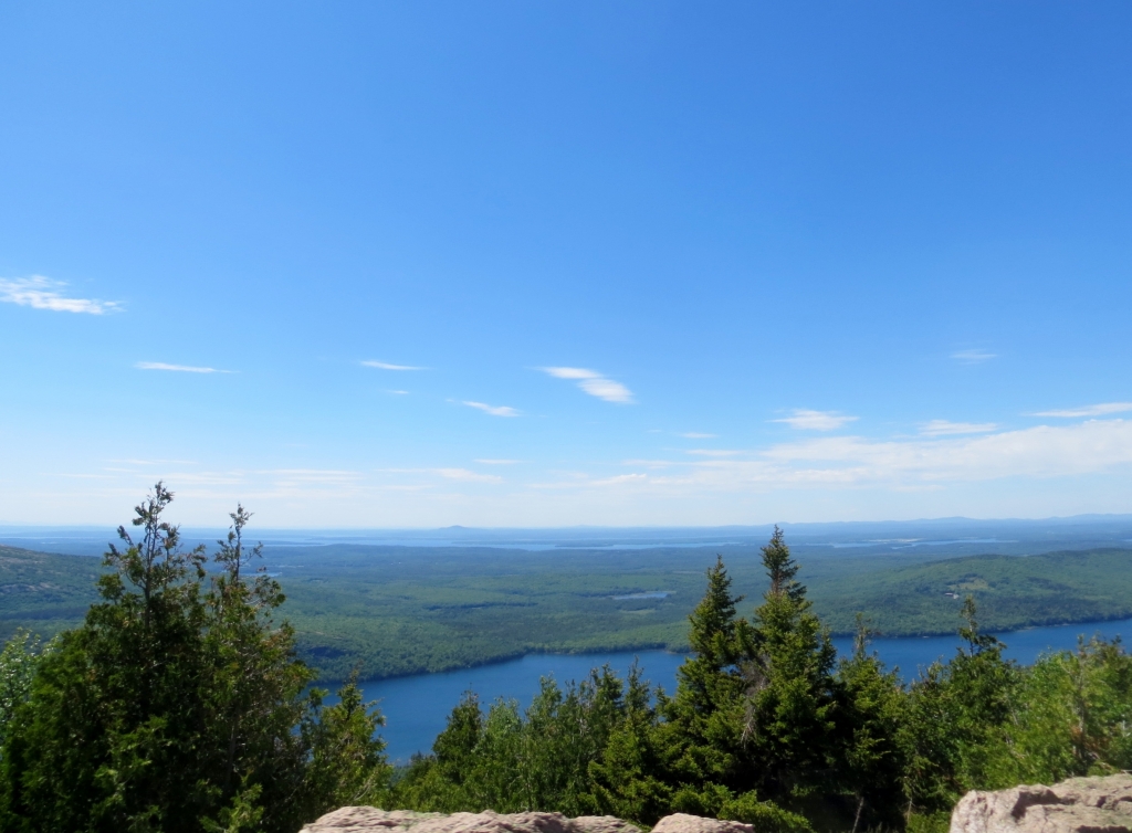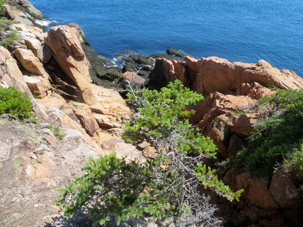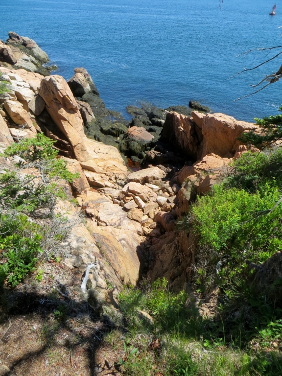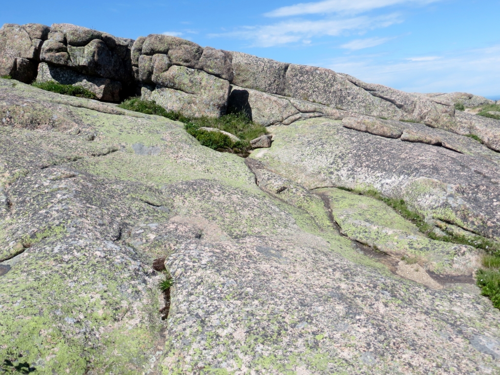 Noch bevor man sie erreicht, zweigt rechts die Straße in den Nationalpark Acadia ab, den wir am folgenden Tag anfahren. Wie gut, dass wir uns die 25$ sparen können, wir haben ja einen Jahrespass. Danke wieder mal, liebe Kollegen! Acadia erstreckt sich im Osten der Insel und ist der erste Nationalpark, der in den 30er Jahren östlich des Mississippi gegründet wurde. Seine Attraktion liegt nicht zuletzt in dem 466m hohen Mount Cadillac, dessen Gipfel einen kompletten Rundblick erlaubt und auf dem man morgens, z. Zt. um 4.30h, die ersten Sonnenstrahlen sehen kann, die auf die USA treffen. Unsére Sache ist das nicht wirklich – zur Schlafenszeit und bei der Kälte nachts – aber hoch fahren wir natürlich und werden mit einem Rundblick belohnt, der seinesgleichen sucht. Leider ist es etwas diesig, trotzdem ein Traumplatz. Wir nehmen den 24 Meilen langen Round Loop, der am Meer entlang zuerst nach Süden führt, um dann in einer großen Schleife im Landesinnern zurückzuführen. Weit unten halten wir am Thunder Hole, wo die Brandung eine große Felsgruppe ausgehöhlt hat, sodass das hineinschlagende Wasser donnernde Geräusche erzeugt. Leider nur bei entsprechend rauer See und ca. zwei Stunden vor High Tide zu hören, die falsche Zeit für uns, aber das hält uns und gefühlte 100 Andere nicht davon ab, auf die Klippen hinauszuklettern und zu fotografieren. Der Teil des Loops im Landesinnern ist relativ langweilig, Bäume eben, und was man dem an Fahrspaß entgegensetzen könnte, wird von der durchgängigen Geschwindigkeitsbegrenzung von 35 mi doch stark reduziert.