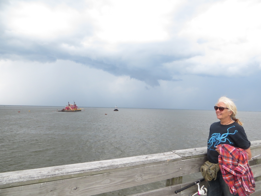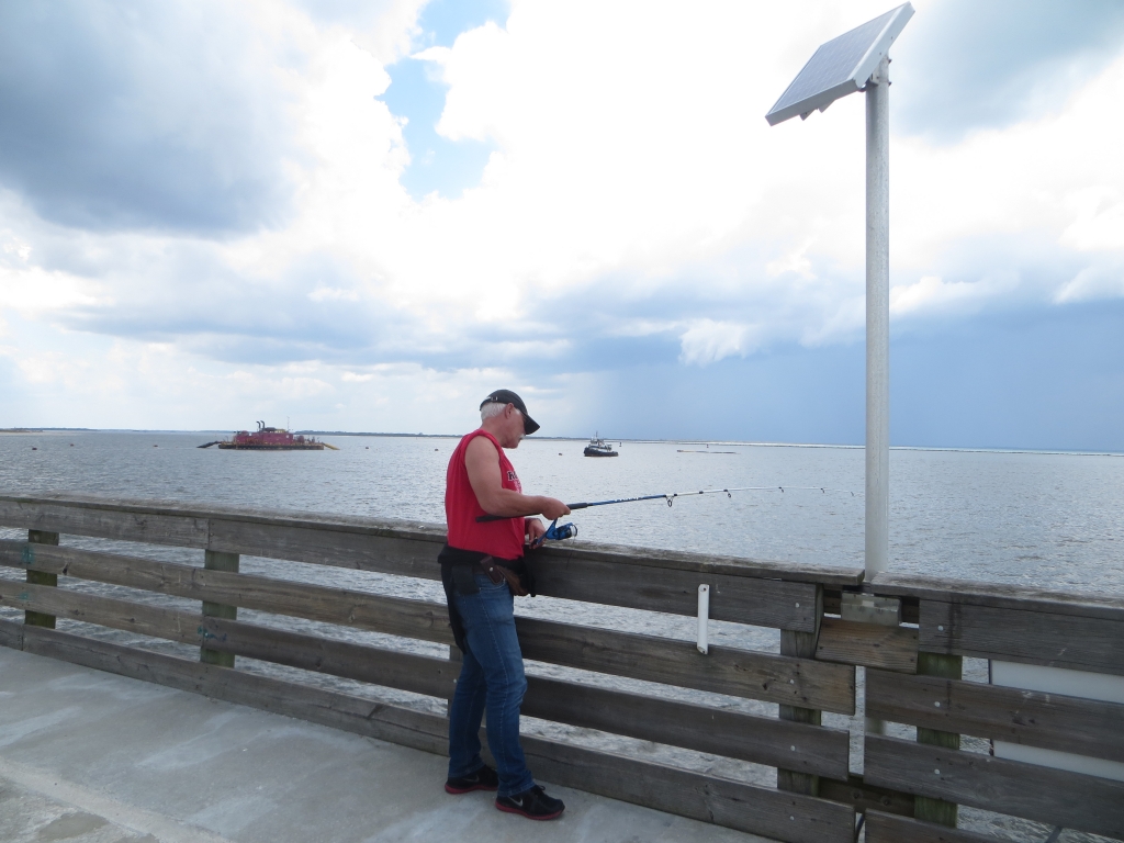 Nach Wochen des guten und bequemen Lebens wollen wir mal wieder wissen, wie das Campingleben sich nach den Wintermonaten so anfühlt, und so fahren wir nach unserem Abschied von St. Augustine an der Küste hoch bis nach Fernandina Beach. Dort liegt der wunderbare Fort Clinch State Park am Meer und wir haben Glück: Obwohl wir nicht angemeldet sind, bekommen wir den letzten zur Verfügung stehenden Zeltplatz, weil einer seine Anmeldung vor 10 Minuten verfallen lassen hat. Wir buchen 2 Übernachtungen und legen später noch eine nach, weil es uns so gut gefällt. Die Parkstraßen sind alleeartig von Baumkronen überwölbt, die den Abschluss eines naturbelassenen Waldes bilden, dessen dreistöckige Gliederung an den Aufbau des Regenwaldes erinnern. Die Campside ist schön geräumig und wir stellen das Zelt auf, nicht ohne uns ausgiebig über während des Winters entstandene Schimmelflecken geärgert zu haben. Die langen Sandstrände sind dafür berühmt, dass man kleine, angeschwemmte Haifischzähne finden kann, aber unsere Suche bleibt vergeblich. Ebenso bleiben wir bei unseren Angelversuchen Schneider, aber der Blick von dem unendlich langen Angelsteg entschädigt uns. Auf dem Weg dorthin führt der Steg durch eine bewachsene Dünenlandschaft und wir trauen unseren Augen nicht, als wir im vollen Tageslicht 2 Armadillos, Gürteltiere, antreffen, die putzmunter nach Nahrung suchen, obwohl sie als nachtaktive Tiere eigentlich schlafen sollten. Auch eine große, braune Schlange läuft uns über den Weg, allerdings sucht sie beim Anblick der grellbunt gekleideten Menschen das Weite. Nachts setzt sich unsere Tiershow fort, als wir, durch großen Lärm geweckt, einen Racoon, einen Waschbären vor unserem Zelt sichten, der sich auch durch den Schein der Taschenlampe nur schwer davon abbringen lässt, weiter unsere Mülltüte auf der Suche nach Fressbarem zu zerlegen. Einige auf dem Tisch vergessene Rosinen und etliche Tütchen Stevia hat er sich bereits einverleibt. In der folgenden Nacht erscheint er erneut und Astrid blickt ihm lange in seine Knopfaugen. Wie schön, diese Tiere auch mal quicklebendig und nicht nur als Verkehrskollateralschaden zu erleben. Auch wettermäßig haben wir Glück: obwohl Regen angesagt ist, begnügt sich die Natur in unserem Park mit dramatischen Drohkulissen am schwarzen Himmel und das Zelt bleibt trocken. Beim Einkaufen in Fernandino erwischt es uns doch.