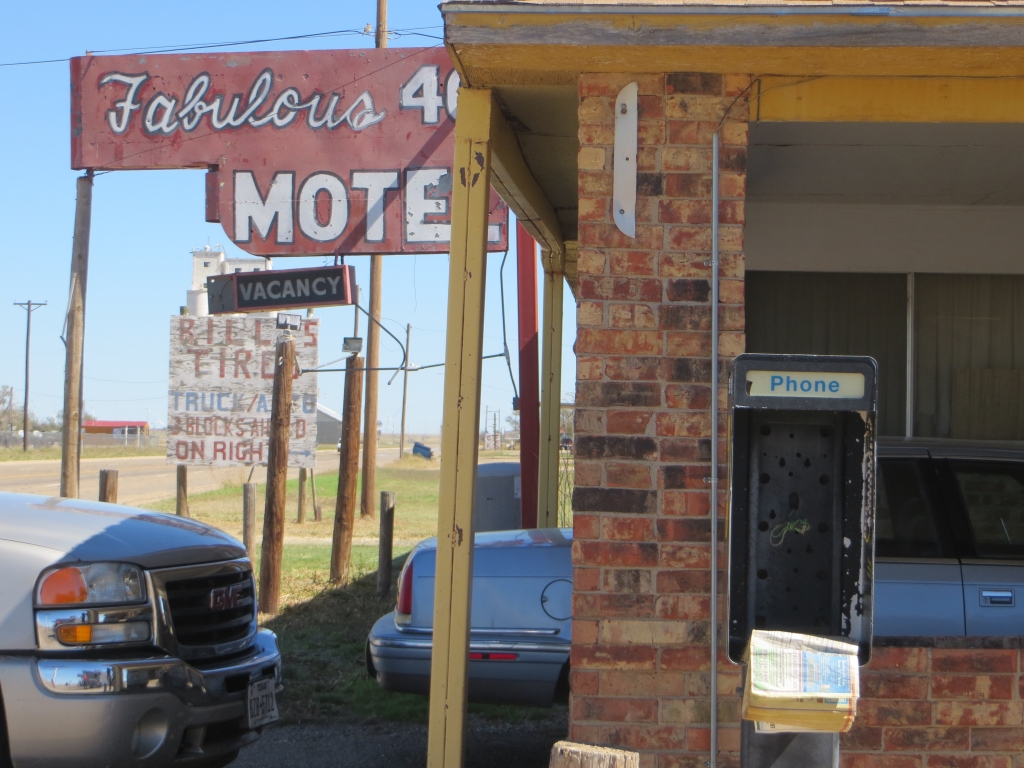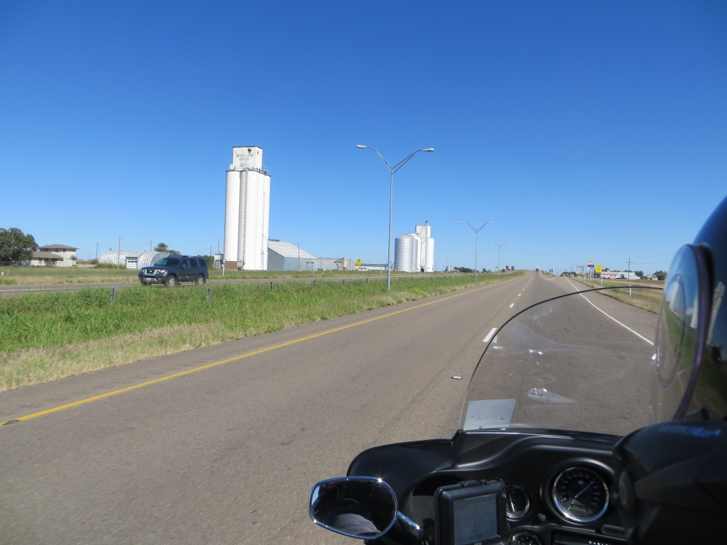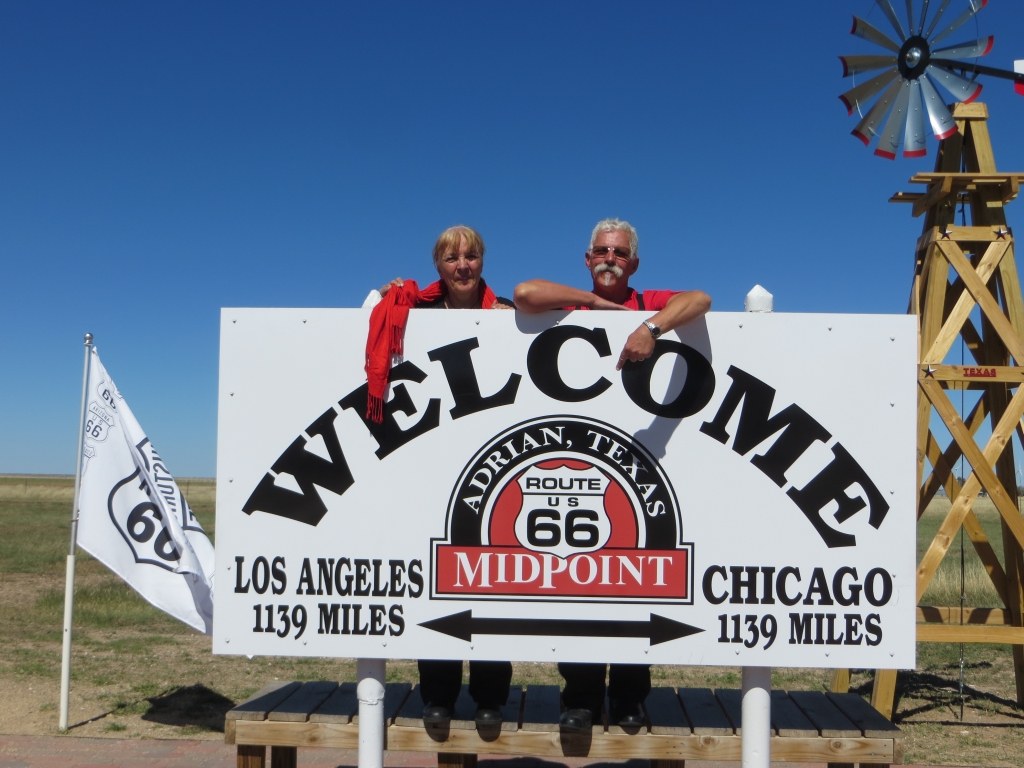 Auf der Weiterfahrt nach Amarillo Texas bleiben wir lieber auf der Interstate. Zu langweilig und in zu schlechtem Zustand zieht die 66 neben unserer Autobahn her. Vorgemerkt sind der Exit Glenrio und Adrian, der erste führt uns in ein völlig verlassenes Örtchen mit Motelruine,der zweite zum Mittelpunkt der Route 66, der von Chicago und Santa Monica gleich weit entfernt ist. In dem mit den üblichen Devotionalien verzierten Diner kann man lecker essen, was wir auch machen.