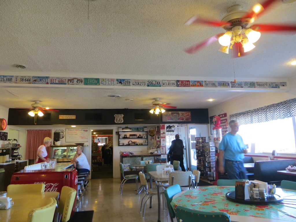 Na ja! Aber wir kriegen einen guten Espresso und das Feeling, wie es wohl mal gewesen sein muss, als die haifischflossenverzierten blitzenden Lousinen, Cabriolets, Lastwagen und Pickups hier Halt machten. Abends, schon weg von der 66, übernachten wir in Williams und sind ganz stolz auf unseren neuen Route 66 Aufkleber.