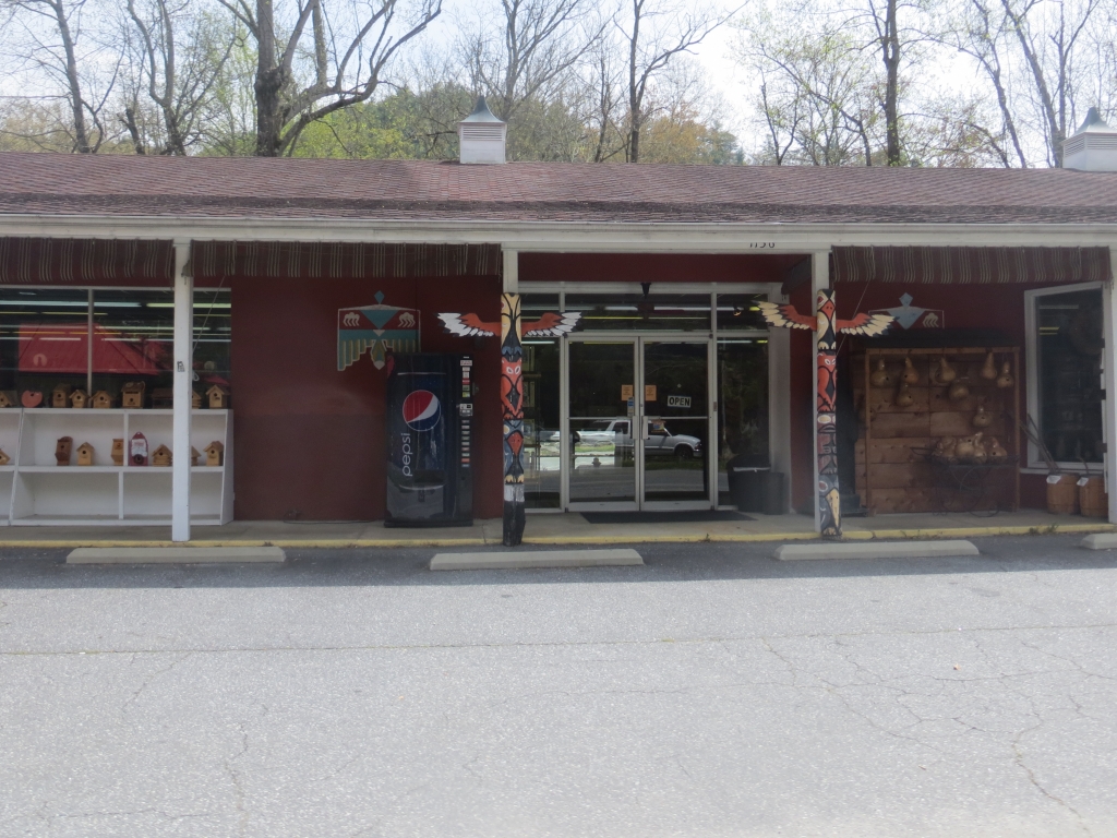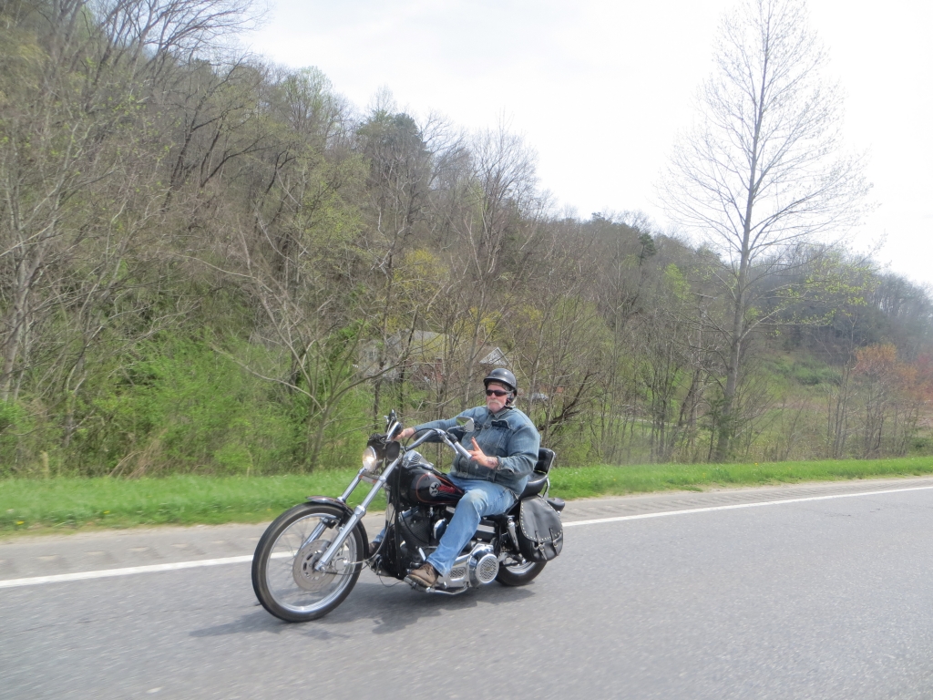 Nach einer herrlichen Fahrt nach Franklin, North Carolina, siehe Video in vorigen Beitrag, beziehen wir dort unser Quartier für eine Woche am 10.04.2015 bei Hanna und Sara. Da für Montag schlechtes Wetter angesagt ist, beschließen wir, gleich am Wochenende 2 Tage in den Bergen zu fahren. Unser Ziel am Samsgtag ist der Dragon Tail, eine nur 11 Meilen lange Strecke, allerdings mit 318 Kurven geschmückt. Da lacht natürlich das Motorradfahrerherz. Schon die Anfahrt auf der 28 ist beeindruckend. In großen Schwüngen zieht sie in die Höhe und wird immer kurviger, je weiter wir uns Deals Gap nähern, dem Ausgangspunkt zum Dragon Tail, siehe tailofthedragon.com. Ein Bikermotel, eine Campside, ein Souveniershop und ein einfaches Restaurant sind allesamt Goldquellen, weil hier immer was los ist, selbst jetzt im Frühling sind etliche Biker unterwegs und sorgen im Grill unter den aus allen erdenklichen Landesteilen stammenden an der Decke aufgehängten und signierten T-Shirts für Umsatz, wenn sie sich nicht gerade vor dem mannshohen Holzdrachen, der vor der Tür steht, gegenseitig fotografieren (ich muss an das Drachenfest auf unserer Motorradausfahrt in den Bayrischen Wald denken). Eine große Sammlung von Polizeistickern aus ganz USA gefallen mir besonders. Der mit Unfallrelikten (mit dokumentenechten Filzern sind „The days of doom“ darauf festgehalten) behängte Baum ist auch das eine oder andere Bild wert. Nachdem wir alles bestaunt haben und mit diet coke unseren Koffeinhaushalt in Ordnung gebracht haben, schleusen wir uns dann in den Dragon Tail bergabwärts ein.