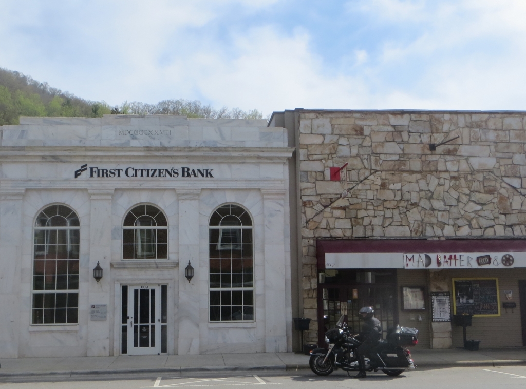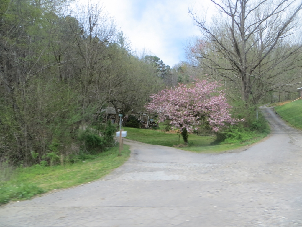 Die Straße führt, wie nicht anders zu erwarten, recht kurvenreich ins Tal und gesellt sich später zu einem Fluss, der von Kajakfahrern genutzt wird, zuerst von denen, die Wildwasserkönner sind, und weiter unten schließlich von denen wie du und ich, oft in großen Schlauchbooten. Der Frühling, der oben in den Bergen noch nichts außer Grün produziert hat, war hier unten schon fleißig und wir freuen uns über weiß blühendes dogwood und rosa redbud, dazwischen immer wieder gelbe und violette Blumen. Eine tolle Fahrstecke läuft langsam aus ins Tal hinein.