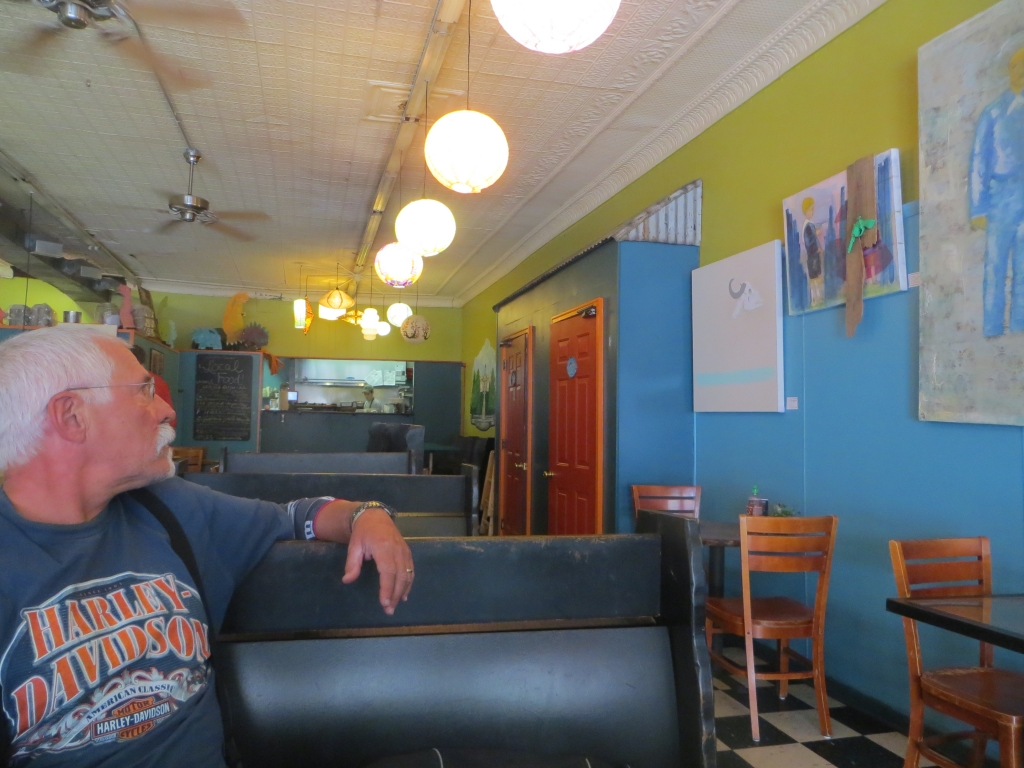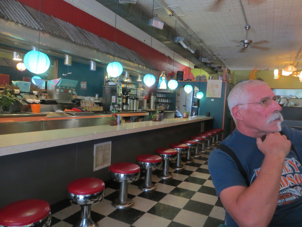 Natürlich ist wie immer eine vorsichtige und vorausschauende Fahrweise angebracht, die Straßenränder sind unbefestigt und rutschig. Ein Harleykollege hat das nicht so ganz beherzigt und ist von der Straße abgekommen. Er liegt wie ein Käfer auf dem Rücken, alle Viere nach oben, was ein gutes Zeichen ist. Wir halten an, denn der Unfall ist gerade eben passiert und noch niemand zur Stelle. Als ich das Motorrad auf dem Gras neben dem Asphalt abstellen will, lege ich die Maschine erst mal hin, der Boden ist zu schlüpferig. Als wir bei dem verunfallten Mann und seiner nagelneuen Electra Glide ankommen, hat ein Auto angehalten und man hat ihm den Helm abgezogen. Gottseidank reagiert er positiv auf meine Aufforderungen, Arme und Beine zu bewegen. Keine großen Verletzungen also, aber er klagt über Schmerzen in der Brust. Wahrscheinlich gebrochene Rippen. Ich trenne seinen Helm von der Maschine, das Spiralkabel zur Musikanlage ist meterlang gedehnt. Die Harley hat im nassen Gras tiefe Spuren hinterlassen, die den Unfallhergang nachvollziehen lassen. Der Fahrer hat Glück gehabt: Nur 2 Meter weiter beginnt ein steiler Abhang…Als Krankenwagen und Polizei eintreffen, machen wir uns schnell aus dem Staub, um langwierigen Befragungen zu entgehen, wir haben den Unfall selbst ja auch nicht gesehen. Nach etwa 1,5 Stunden verlassen wir den BRP wieder und fahren nach Sylva hinunter, wo wir uns einen Kaffee mit Lemon-Ingwer-Pie genehmigen. Inzwischen hat sich der Himmel zugezogen und wir warten auf ein Gewitter. Petrus aber hat Nachsicht mit uns und wir kommen trockenen Leibes bei Hanna und Sara an.