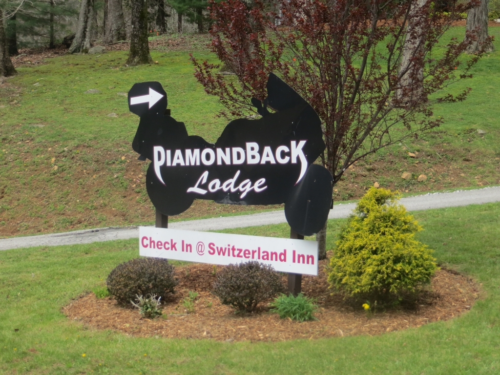 Nach einer herrlichen Fahrt nach Franklin, North Carolina, siehe Video in vorigen Beitrag, beziehen wir dort unser Quartier für eine Woche am 10.04.2015 bei Hanna und Sara. Da für Montag schlechtes Wetter angesagt ist, beschließen wir, gleich am Wochenende 2 Tage in den Bergen zu fahren. Unser Ziel am Samsgtag ist der Dragon Tail, eine nur 11 Meilen lange Strecke, allerdings mit 318 Kurven geschmückt. Da lacht natürlich das Motorradfahrerherz. Schon die Anfahrt auf der 28 ist beeindruckend. In großen Schwüngen zieht sie in die Höhe und wird immer kurviger, je weiter wir uns Deals Gap nähern, dem Ausgangspunkt zum Dragon Tail, siehe tailofthedragon.com. Ein Bikermotel, eine Campside, ein Souveniershop und ein einfaches Restaurant sind allesamt Goldquellen, weil hier immer was los ist, selbst jetzt im Frühling sind etliche Biker unterwegs und sorgen im Grill unter den aus allen erdenklichen Landesteilen stammenden an der Decke aufgehängten und signierten T-Shirts für Umsatz, wenn sie sich nicht gerade vor dem mannshohen Holzdrachen, der vor der Tür steht, gegenseitig fotografieren (ich muss an das Drachenfest auf unserer Motorradausfahrt in den Bayrischen Wald denken). Eine große Sammlung von Polizeistickern aus ganz USA gefallen mir besonders. Der mit Unfallrelikten (mit dokumentenechten Filzern sind „The days of doom“ darauf festgehalten) behängte Baum ist auch das eine oder andere Bild wert. Nachdem wir alles bestaunt haben und mit diet coke unseren Koffeinhaushalt in Ordnung gebracht haben, schleusen wir uns dann in den Dragon Tail bergabwärts ein.