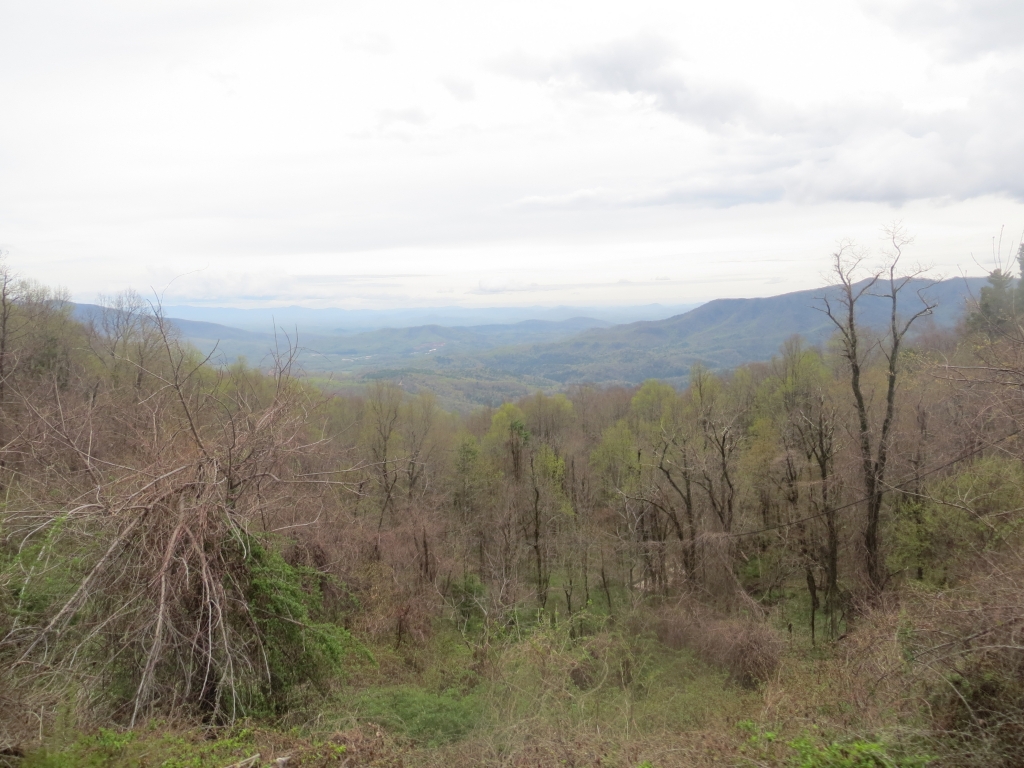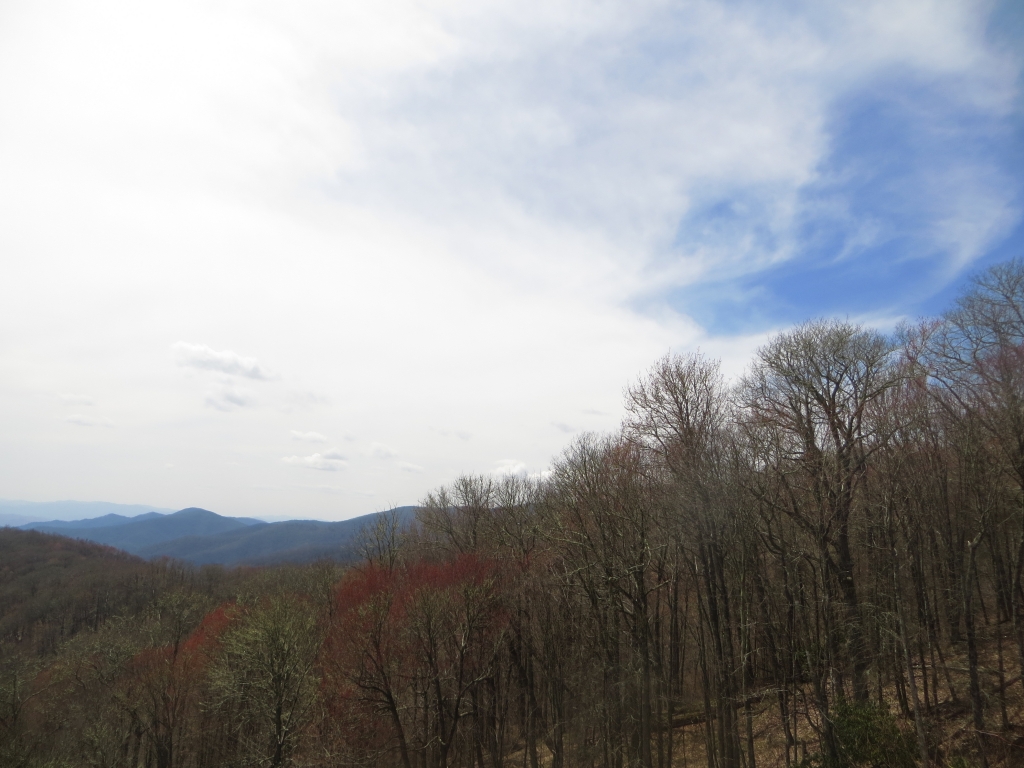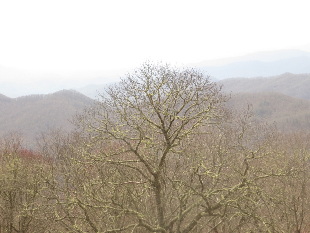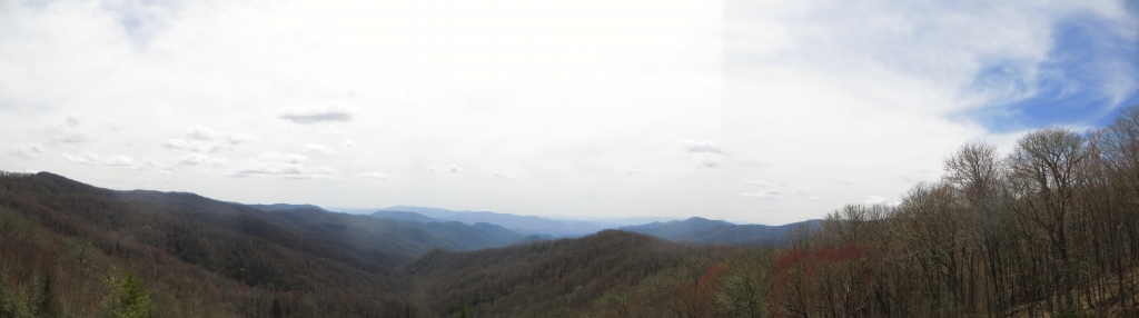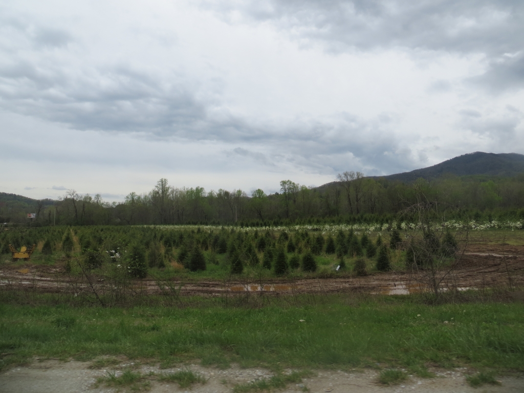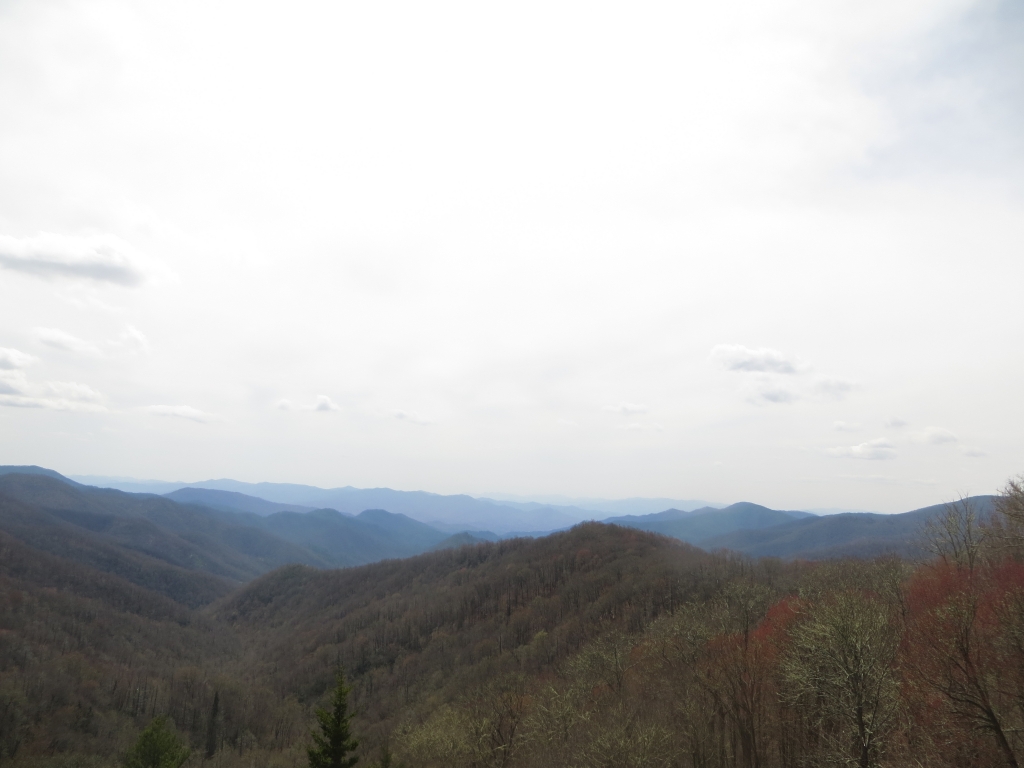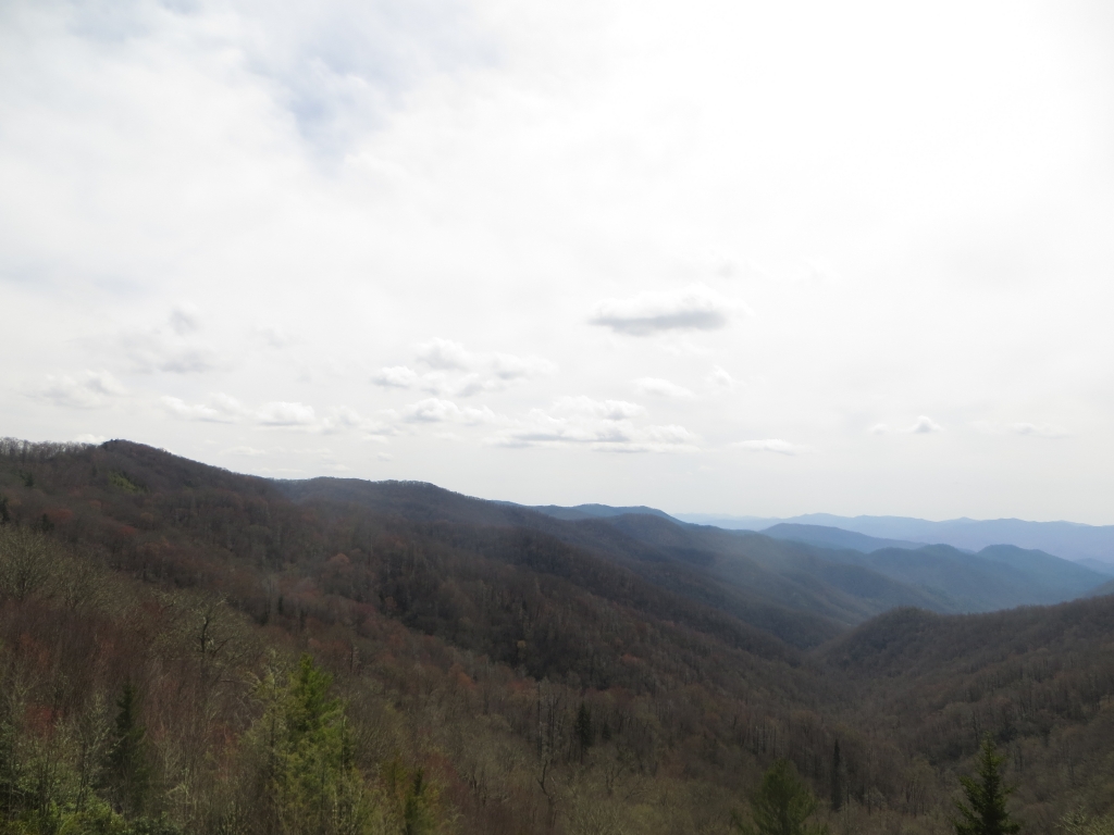 Wir halten uns nur zum Tanken auf und flüchten dann auf die 441, die uns in den Great Smokey Mountains National Park führt. Wir sind nicht so sehr begeistert: Zwar ist die Straße in gutem Zustand und interessant zu fahren, aber die Aussichtspunkte sind eher langweilig und die Natur eintönig. Wir sind hier halt zu früh dran. Nach etwa 2 Drittel der Strecke passieren  wir die Staatsgrenze nach Tennessee und drehen kurz vor Gatlinburg wieder um. Wir wollen ein Stück des berühmten Blue Ridge Parkways fahren, der hier im Nationalpark beginnt und sich 469  Meilen nach Virginia zieht. Wie der Natchez Trace Parkway ist auch er für den kommerziellen Verkehr gesperrt und weist eine Höchstgeschwindigkeit von 45 – 55 Meilen auf. Die Staße wurde in den 30er Jahren zur Zeit der Depresssion geplant und als Arbeitsbeschaffungsmaßnahme begonnen, erste Streckenabschnitte wurden 1930 fertig, andere erst in den letzten Jahren.