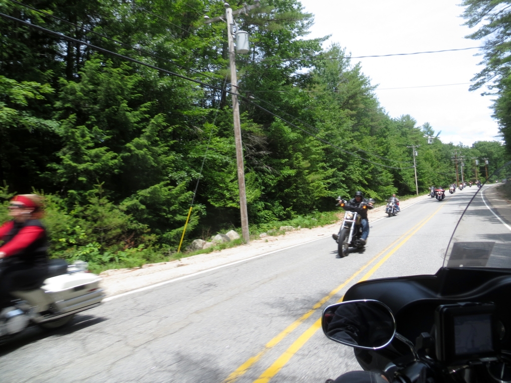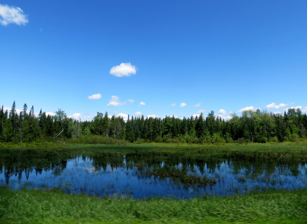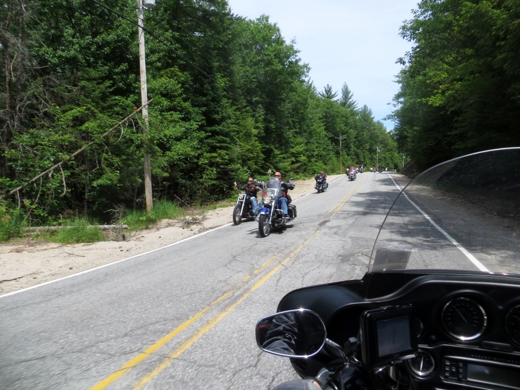 An einem der schönen Tage fahren wir um den Long Lake, mit einer musikalisch untermalten Lunchpause.Die Landschaft ist schön, die Straßen, fast ausschließlich von Wald gesäumt, sind so schlecht, dass Martin während des ganzen Trips die ganze Konzentration aufbringen muss, um nicht zu stürzen. Gefährliche Längsrillen, Abbrüche, riesige Schlaglöcher lassen uns auf dem Motorrad hin und her und rauf und runter hoppeln. Mein Nacken und Wirbelsäule sind ständigen Schlägen ausgesetzt. Unsere Hoffnung, dass es ja bald mal besser werden muss, wurde enttäuscht. Der harte Winter hier hat auch bei der Straßendecke schwer zugeschlagen. Und wenn ich mal zwischen den Bäumen einen Seerosenteich ausmache, kann Martin keinen Blick zur Seite riskieren.