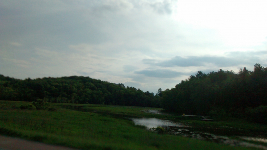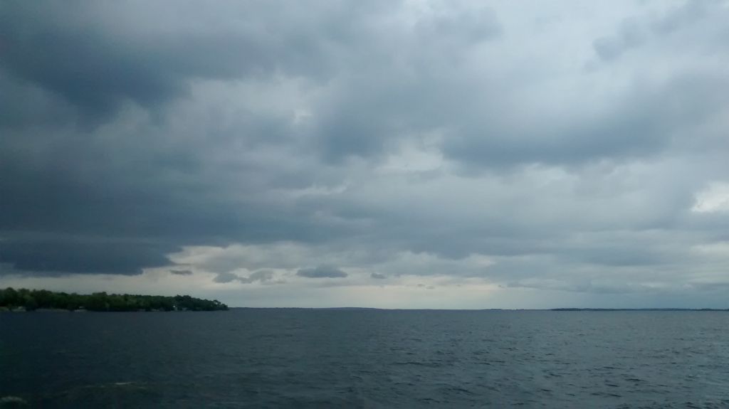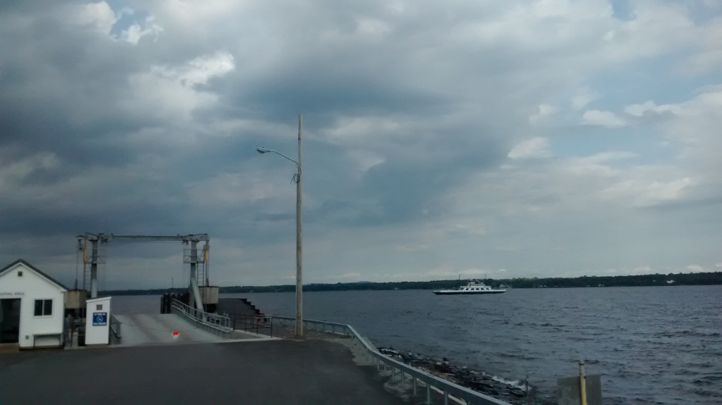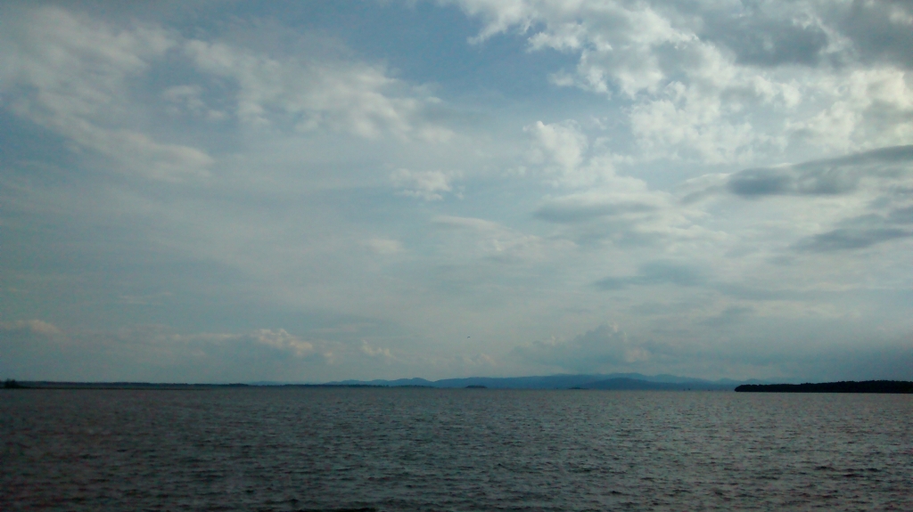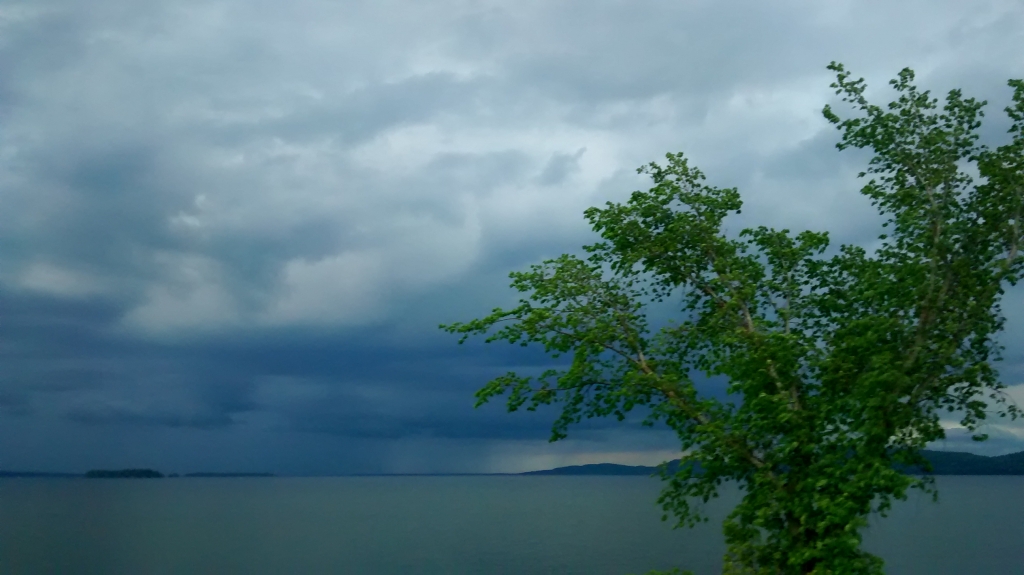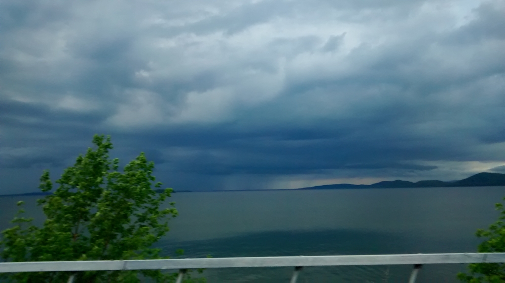 Da kommt eine Frau mit ihrem Sohn und zwei Hunden aus dem Nichts und informiert uns, dass 30 Meilen weiter nördlich in Plattsburg noch eine Fähre nach Burlington fährt. Jetzt nichts wie los, wissen wir doch nicht, wann die letzte abgeht. Unterwegs breitet sich Missmut aus. Ich habe Hunger, wir haben noch keine Antwort bzgl unseres Zimmers und das Unwetter rückt näher. Martin aber unverdrossen will nicht unterwegs übernachten.